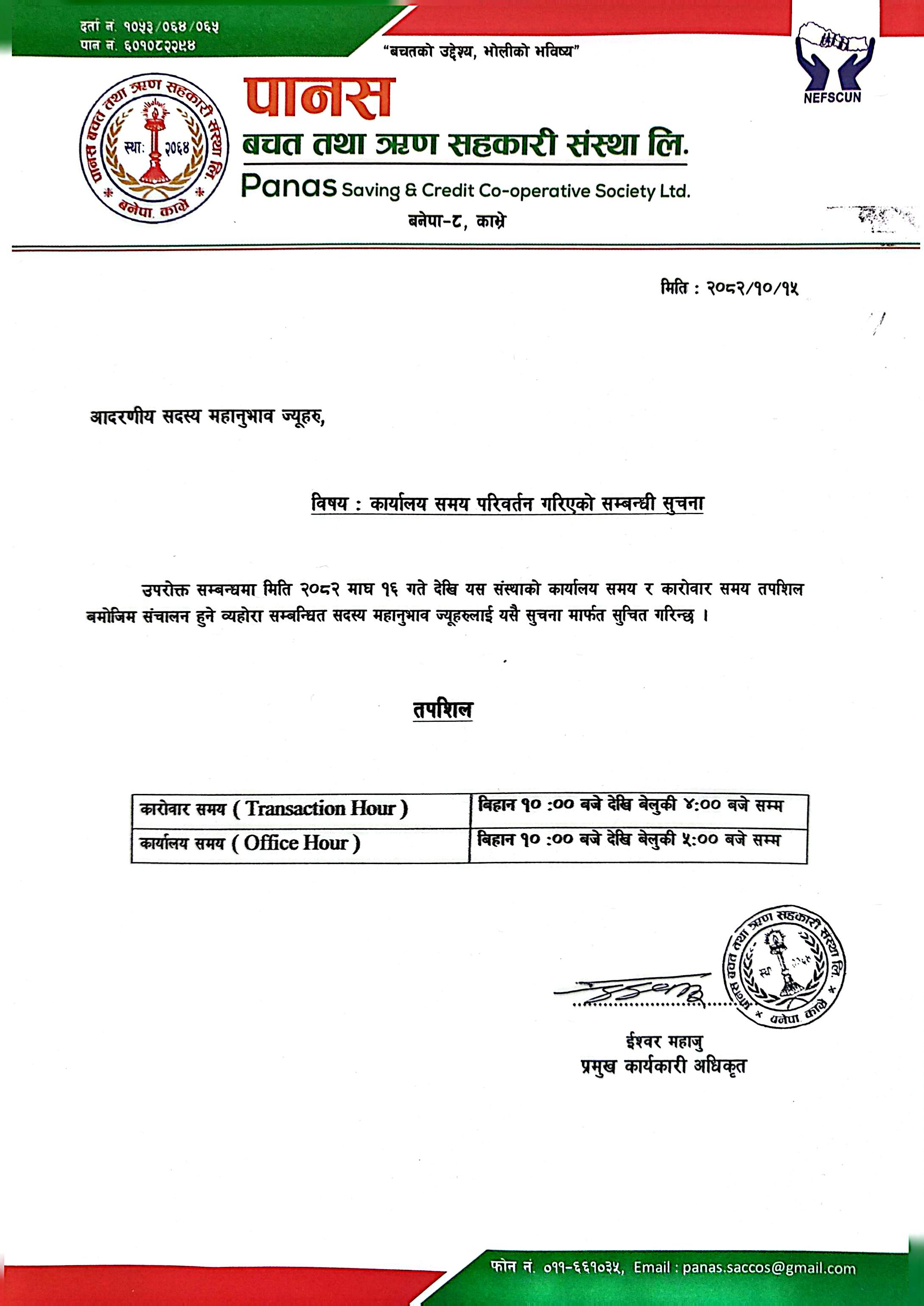 Panas Savings and Credit Cooperative Society established in B.S. 2064, was established with the aim of making the community members prosperous and independent by converting the capital scattered in the community...