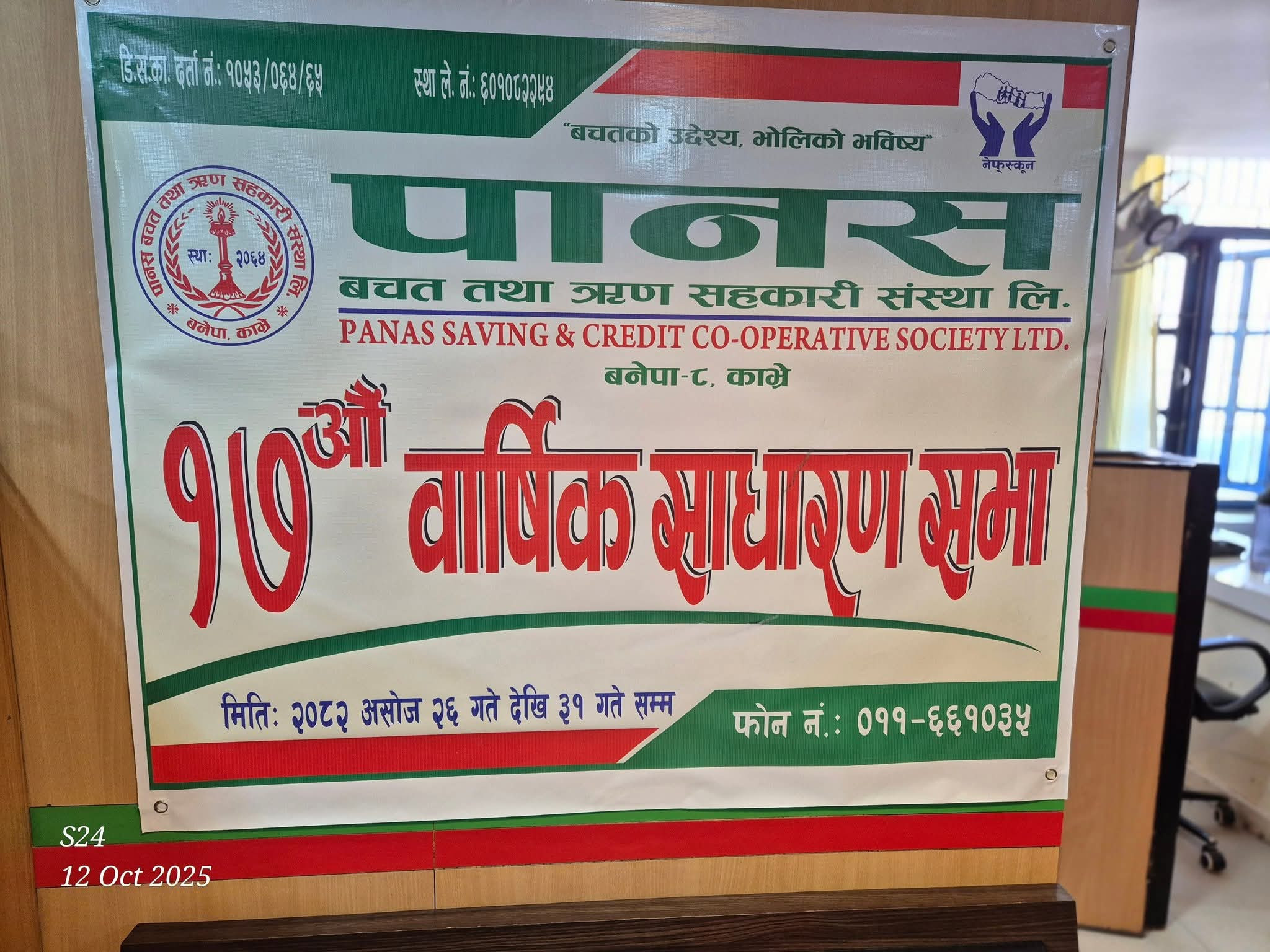 यस पानस बचत तथा ऋण सहकारी संस्था लि. को १७ औ वार्षिक साधारण सभा मिति २०८२ / ०६ / २६ गते आइतबार संस्थाका अध्यक्ष श्री सुशन राजवंशी ज्युको सभापतित्वमा, जेष्ठ सदस्य ज्युहरुको आतिथ्यतामा पानस साकोसको कार्यालयमा सम्पन्न गरियो।